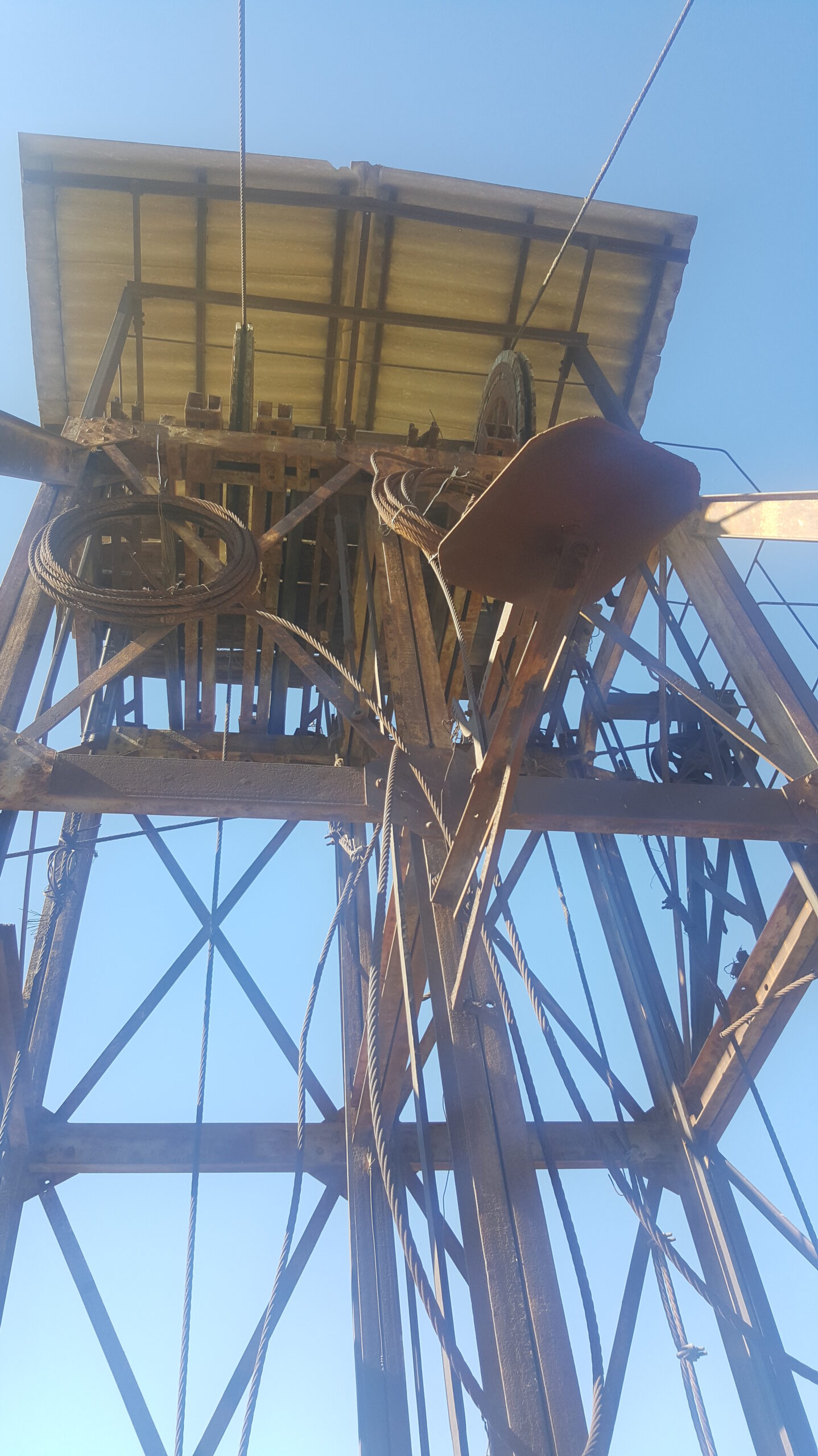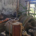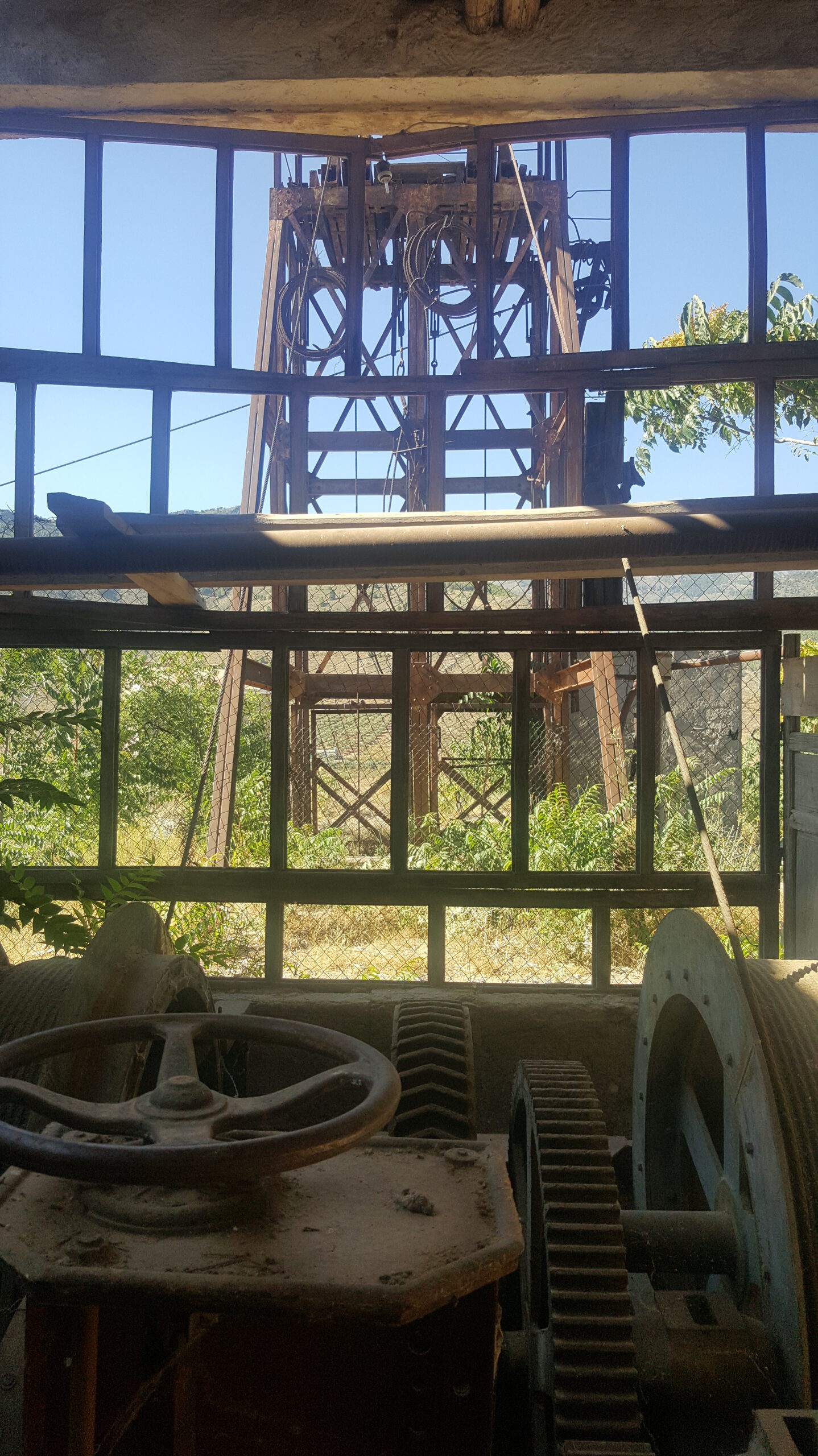 El castillete es formidable, el único que se conserva íntegro en toda la provincia de Almería. Escuchando las explicaciones de Juan, no cuesta trabajo escuchar con la imaginación el ruido de los engranajes y las poleas funcionando como si nunca se hubiesen detenido. La casa de motores guarda toda la maquinaria, milagrosamente salvada del chatarrero. Juan nos explica cómo funcionaba el freno, y nos enseña los dos generadores de aire comprimido, el segundo de los cuales nunca llegó a funcionar. Peor suerte ha corrido la caseta de control, hoy totalmente desprovista del panel de instrumentos.