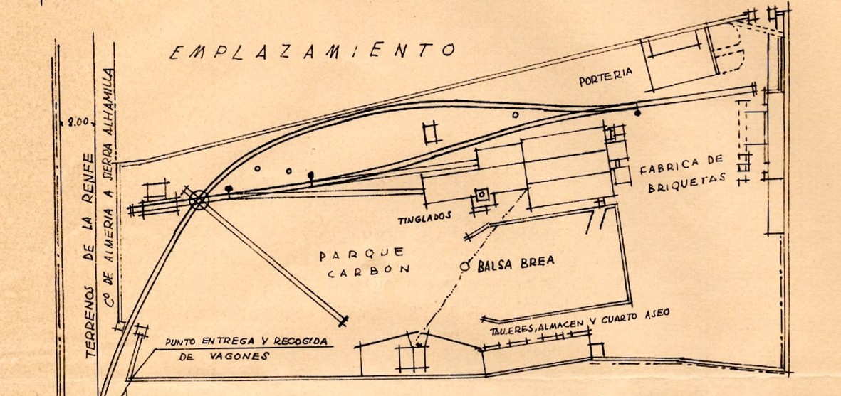 En 1953, en unos terrenos situados junto a la carretera de Níjar del barrio almeriense de Los Molinos, la empresa Contrataciones e Industrias, S.A. inició el montaje de una instalación para la fabricación de briquetas con destino a la Renfe. El empleo de este tipo de combustible para el suministro a las locomotoras de vapor se consolidó a raíz de la política autárquica del régimen franquista, ya que permitió no depender de las importaciones de otros países. Este sistema consistía en calentar el carbón en polvo en una caldera y añadirle un porcentaje determinado de brea seca y alquitrán que previamente se habían fundido. Una vez mezclados estos componentes de manera uniforme con el polvo de carbón, se introducían en unos moldes y se prensaban para darle consistencia; posteriormente, se desmoldaban y ya podían ser transportadas para su utilización como combustible.
