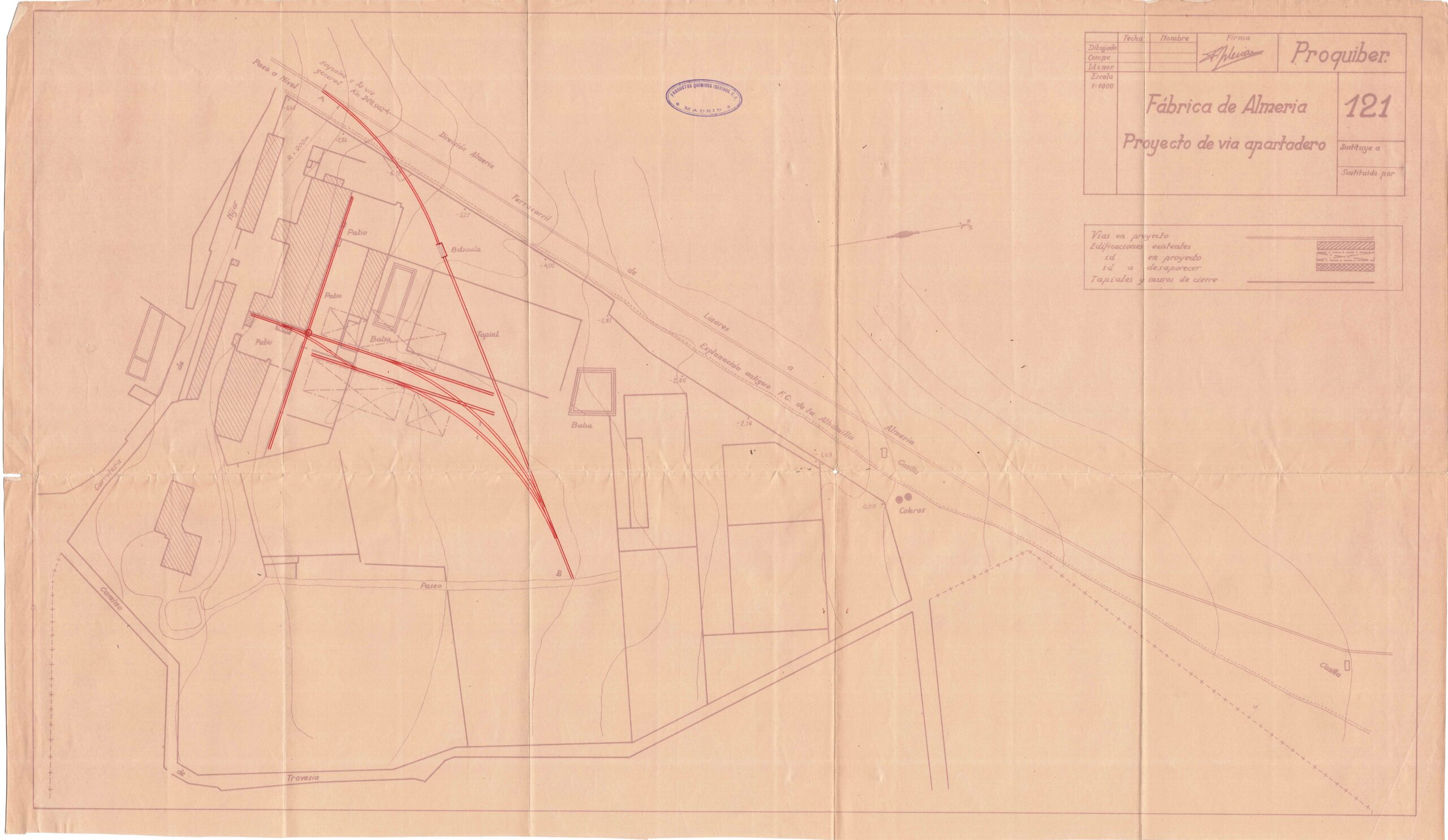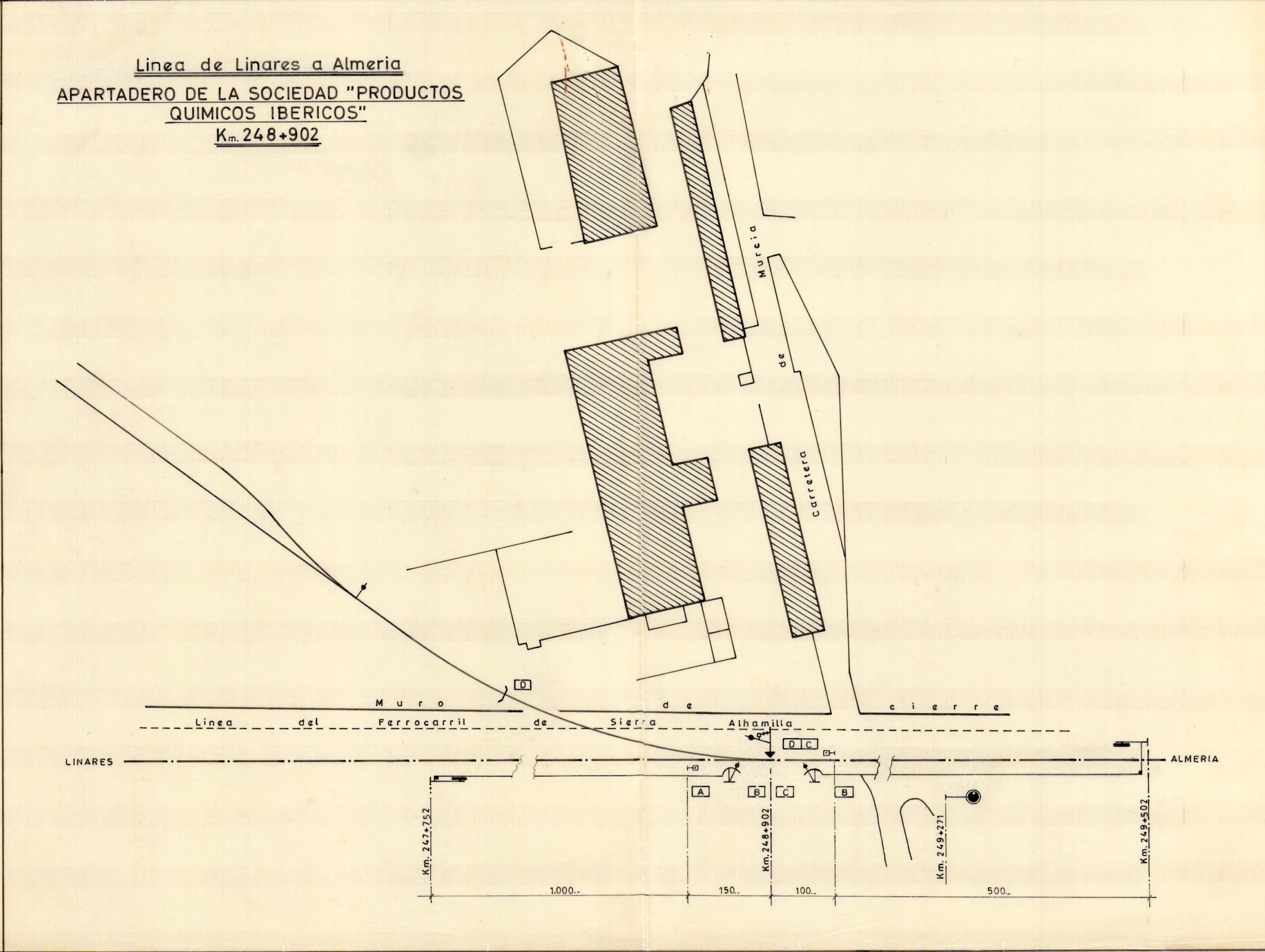 A comienzos de 1945, la dirección de la compañía proyectó una vía-apartadero para atender sus necesidades de transporte y solicitó a la Renfe su instalación en el punto kilométrico 248,902 de la línea de Linares a Almería y «a una distancia de 300 metros aproximadamente fuera del disco de entrada a la estación de Almería, donde la vía se encuentra en pendiente de 0,019466». En este mismo paraje, a finales del siglo XIX, la Compañía de los Caminos de Hierro del Sur de España concedió un apartadero que daba servicio a la que fue Azucarera Nuestra Señora de Montserrat, pero tuvo una vida efímera y sus instalaciones se levantaron. Años después, aunque con una actividad industrial distinta, se volvía a emplazar en el mismo lugar una vía particular. No obstante, antes de aprobar el proyecto presentado y de acometerse las obras, la Renfe planteó la posibilidad de reabrir el antiguo apartadero de Montserrat, ubicado en el lado Linares y en un lugar próximo a la futura factoría, con el fin de establecer desde este punto una vía directa hasta el recinto industrial. Finalmente, en octubre de 1945 se concedió la autorización por parte de la compañía ferroviaria para que en el plazo de un año se ejecutasen las obras del apartadero de acuerdo con el proyecto presentado y cuyo punto de enlace con la vía general sería en el kilómetro 248,490. Como dato curioso, la nueva vía debía atravesar la explanación del antiguo ferrocarril de Sierra Alhamilla que, en ese momento solo era un camino, aunque se indicaba que el concesionario debería correr con los gastos de establecimiento del correspondiente paso a nivel, guardería y protección si dicho ferrocarril volvía a funcionar.