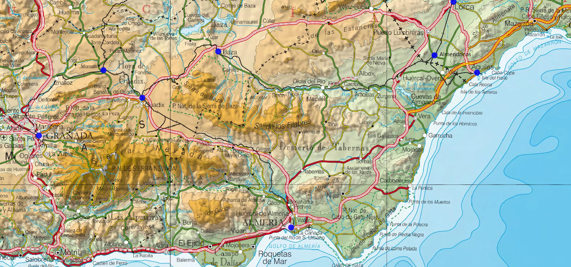 Mapas de conjunto del sureste de España con la provincia de Almería en el centro. Las líneas de ferrocarril en trazado negro continuo. Se han destacado en azul los principales orígenes y destinos y nudos de conexión de las diferentes líneas. Tramo Almendricos – Baza – Guadix clausurado y fuera de servicio desde enero de 1985. Instituto Geográfico Nacional, ambos obtenidos del original a escala 1/1.000.000.