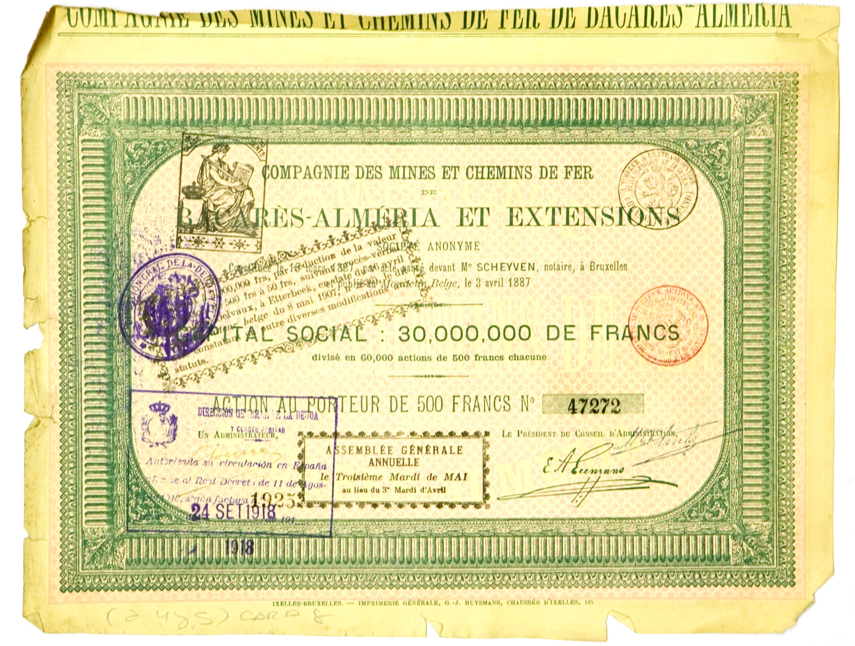 Acción de la sociedad belga Compagnie des mines et chemins de fer Bacares-Almería et extensions que explotó el coto minero “Menas” y varios yacimientos en los términos municipales de Bacares y Macael, todos ellos en la vertiente norte de la Sierra de los Filabres de la provincia almeriense. Para dar…