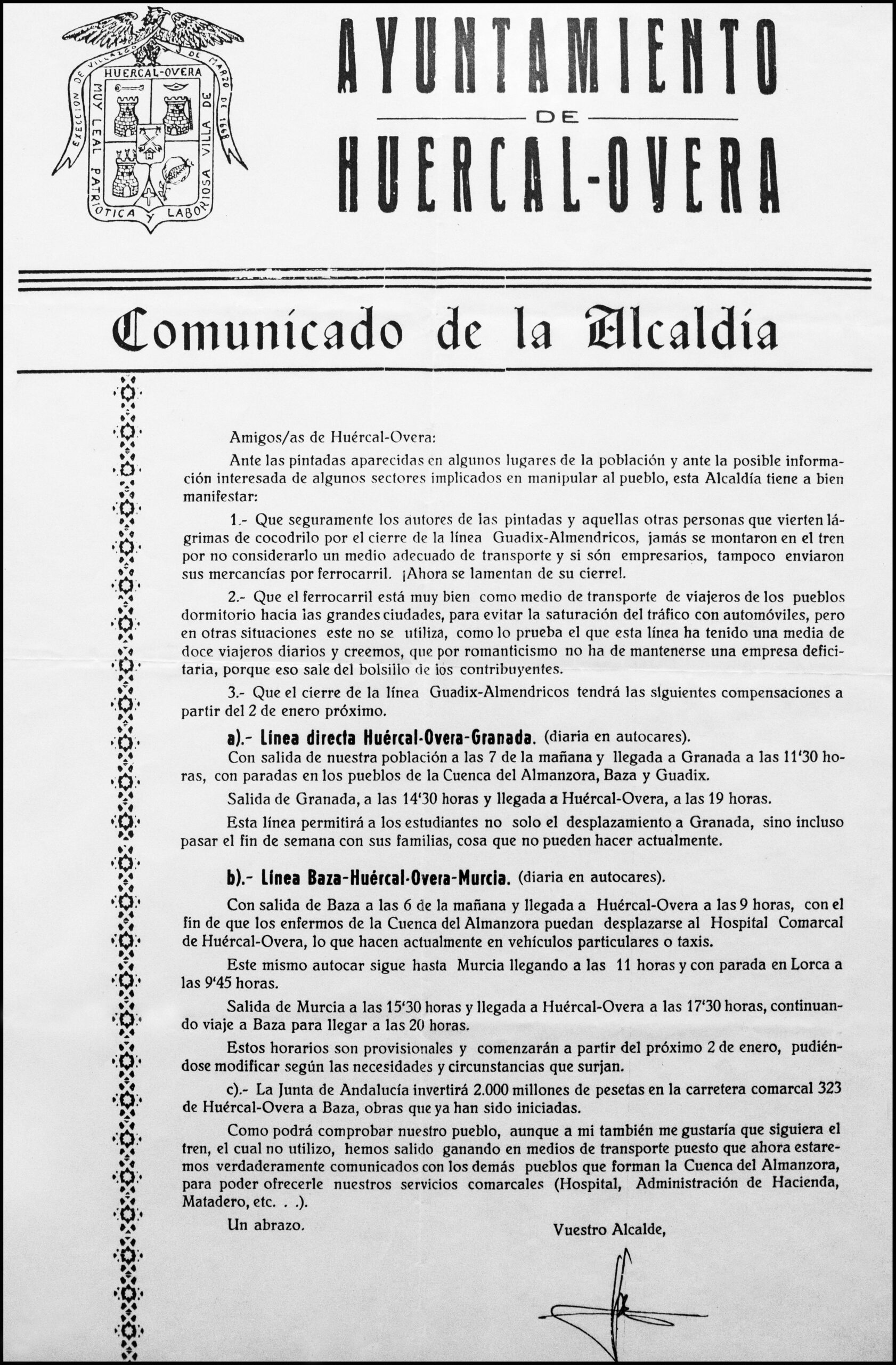EL BANDO DEL ALCALDE DE HUÉRCAL-OVERA ANTE EL CIERRE DE LA LÍNEA DE GUADIX – ALMENDRICOS