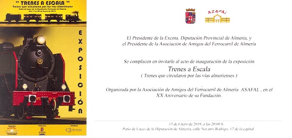 Organizada por la Asociación de Amigos del Ferrocarril de Almería con motivo del XX aniversario de su fundación el pasado año 2018, el martes 15 de enero de 2019 se presentó a la sociedad almeriense esta singular exposición en la que se hace homenaje a algunos de los diferentes trenes,…
