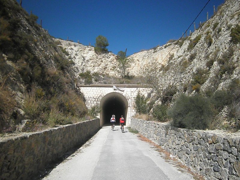 Sin darnos cuenta, entramos en la estación de Cehegín, totalmente restaurada y a la que se le ha añadido una tercera planta para los nuevos usos relacionados con el sector hostelero. Todavía está en pie el muelle cubierto de mercancías y se ha hormigonado la explanada que hay entre esta construcción y el edificio de viajeros.A la salida de esta estación pasamos por un antiguo paso a nivel y, en leve ascenso, continuamos hasta adentrarnos en el único túnel de este tramo, a medio iluminar, pero con el firme en perfecto estado. Los 255 metros de longitud se recorren con rapidez para atravesar el último puente de la línea, el que salva el río Argos. Una construcción de fábrica de 193 m. de longitud con 3 arcos de 21 m. de luz y 2 de 11 m. de luz ubicado en el P.K. 74,652, muy cerca del final de la línea, ya que apenas quedan 4 km. de trayecto. La vía va paralela a la carretera comarcal 415 hasta llegar a la estación de Caravaca, en pleno casco urbano de la ciudad de la Cruz. De misma planta que la colateral de Cehegín, hoy es la sede de la central de reservas y de la delegación Noroeste del Consorcio de Vías Verdes e la Región de Murcia. Del resto de los edificios que en su día contaba el recinto ferroviario, tan solo subsisten el muelle cubierto de mercancías y el cocherón de locomotoras.