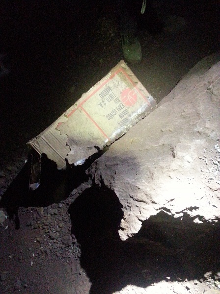 Al fondo de las labores efectuamos un curioso hallazgo, una caja vacía de explosivos y un rollo también vacío de cable detonador, así como una espuerta para llevar el mineral. La importancia de este descubrimiento es que nos ha servido para demostrar que, efectivamente, la actividad minera se prolongó, al menos, durante los años 70, a pesar de que en el expediente administrativo no se haya encontrado ningún documento que lo acreditase. Y si podemos demostrarlo es, precisamente, porque tanto la caja de explosivos como el rollo de cable corresponden a Unión de Explosivos Río Tinto S.A., de Madrid, compañía que fue fundada en 1970 a partir de la fusión de Unión de Explosivos de España y la Compañía Española de Minas de Río Tinto.
