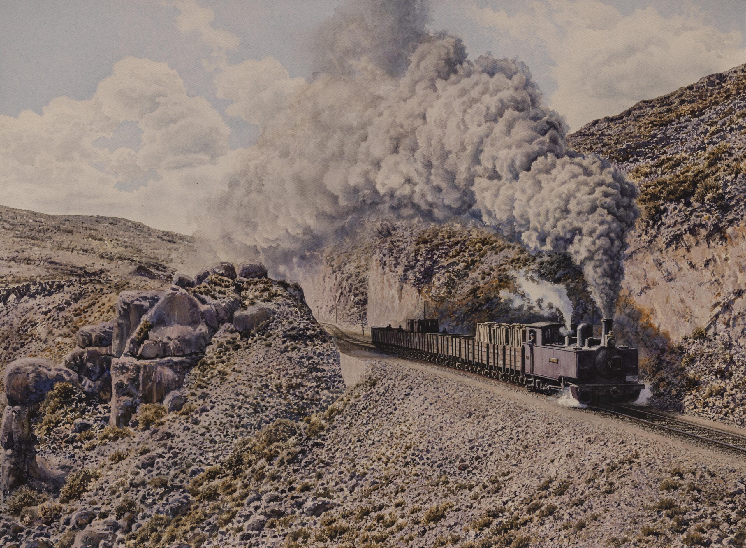 Acuarela que recrea un tren ascendente del FC de Lucainena a Aguamarga