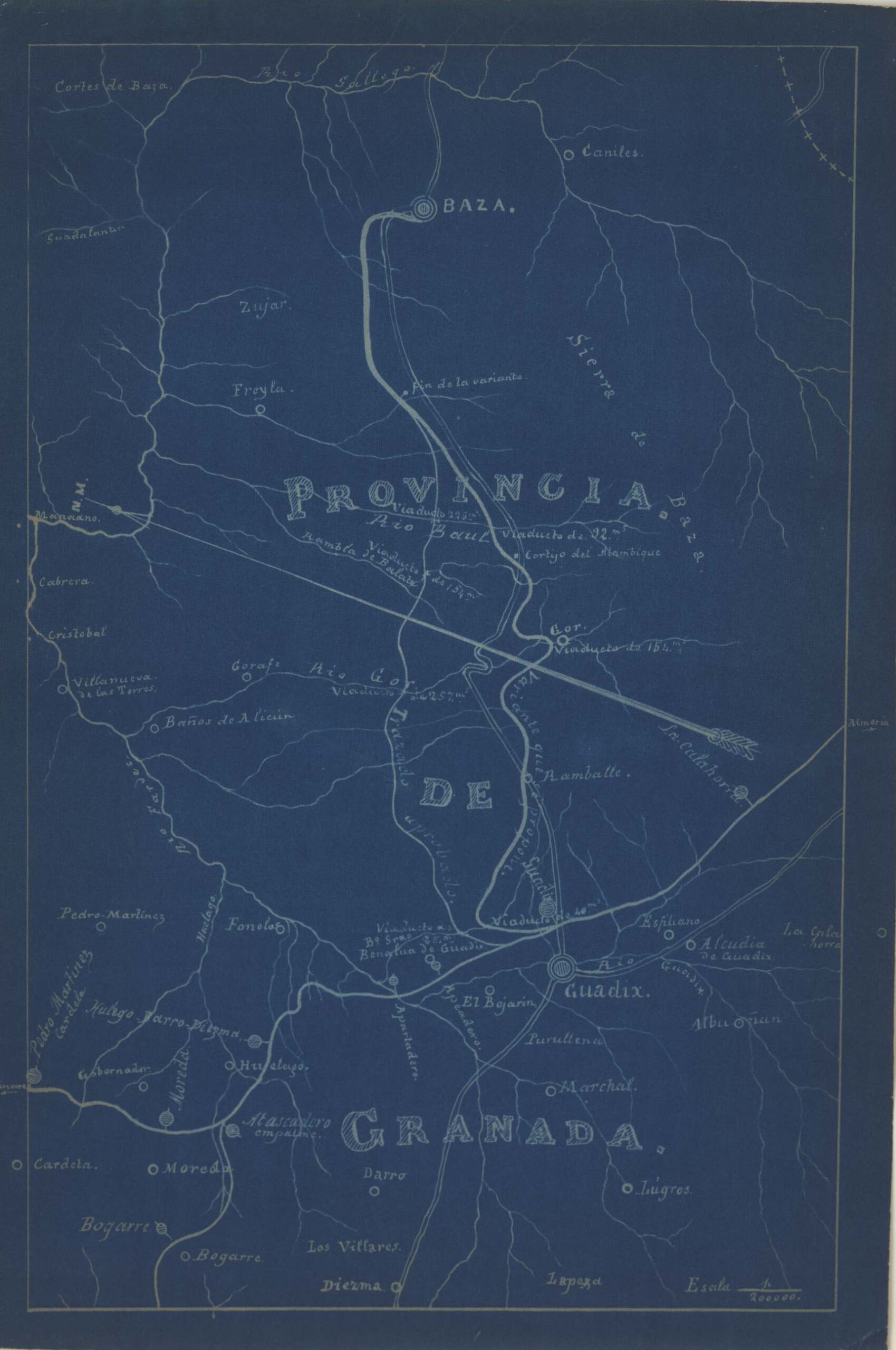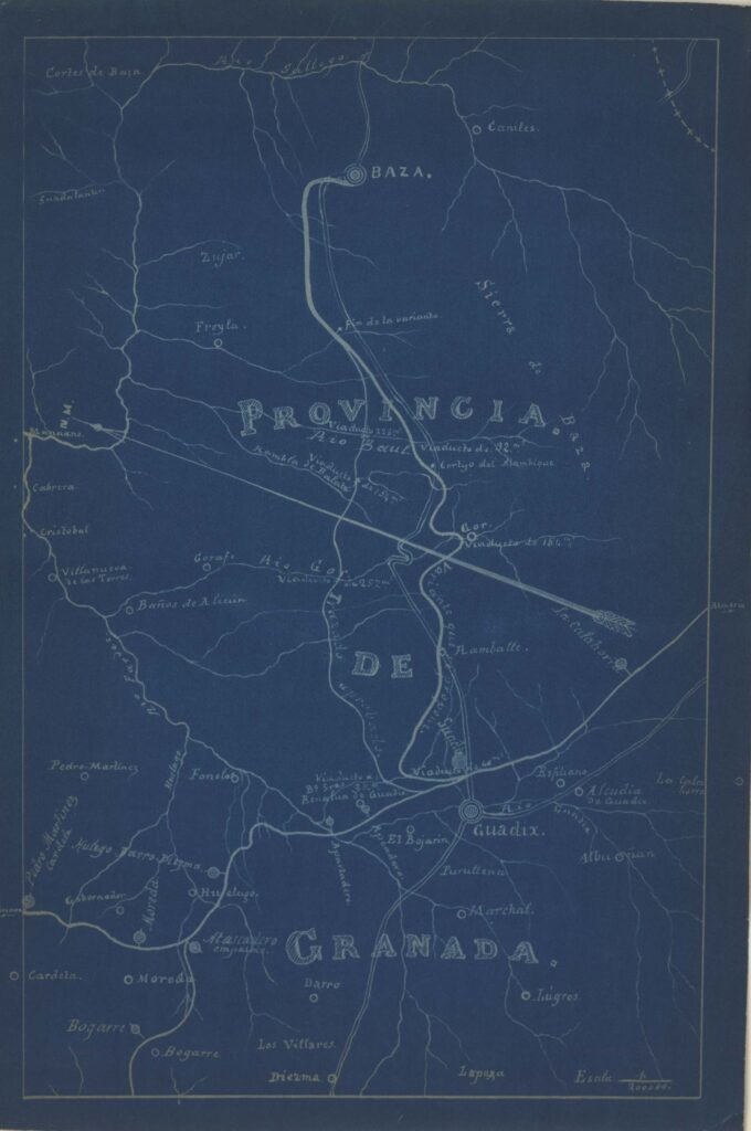 El trazado proyectado por The Granada Railway entre Baza y Granada presentaba algunas diferencias respecto a cómo quedó finalmente. El mapa provincial de José Bertuchi de 1900 señalaba un trazado entre Baza y Guadix más al norte y alejado de los núcleos de Freila,Gorafe, Gor, Hernán Valle y del propio Guadix. En el camino hacia Moreda pasaba junto El Bejarín y tomaba el curso del río Fardes pasando junto a la localidad de Fonelas para después continuar hacia Huélago por el curso del arroyo de su mismo nombre y llegar a la estación de Moreda, a unos dos kilómetros de la localidad. Desde ahí el trazado hacia Granada tomaría dirección noroeste rodeando el núcleo de Moreda para dirigirse hacia Piñar e Iznalloz y Deifontes siguiendo los cursos de los ríos Piñar y Cubillas.