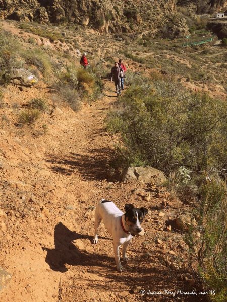 Finalmente, acortamos ligeramente el recorrido original marcado tomando uno de los senderos locales, lo cual nos llevó a descender bruscamente otra vez hasta un arroyo y ascender una vez cruzado éste. Tras pasar por unos huertos, llegamos prácticamente al centro del pueblo. Nuestra mascota, a la que habíamos decidido bautizar como Barrenero antes de conocer su nombre verdadero, regresó con su dueño a quien le relatamos la proeza que había protagonizado su can para nuestro deleite. Finalmente, tras un breve descanso en la plaza del pueblo, nos dirigimos a Padules para recuperar líquido y energías con una suculenta comida en el restaurante Antonio Abad.