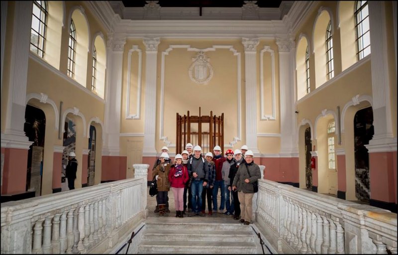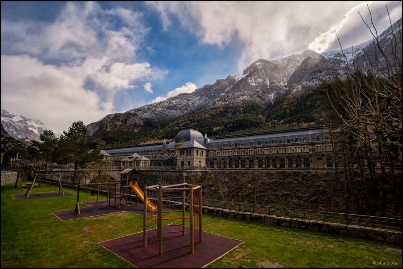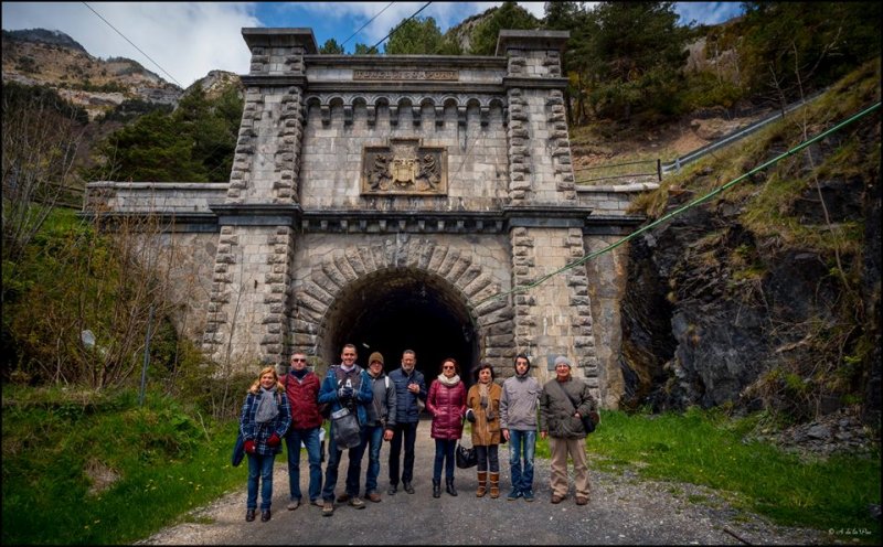 Llegamos a la estación de Canfranc a media mañana. La temperatura era muy fría, especialmente para un grupo de sureños como nosotros depositados a casi a 1200 metros de altitud con una borrasca amenazante empezando a dejar señales. Tras un reparador desayuno, empezamos a reconocer el terreno de la mano de Alejandro De la Paz, nuestro compañero experto conocedor de todo el entramado de Canfranc y especialmente, de su historia .  Previamente habíamos visitado la oficina de turismo para recoger alguna documentación  con el fin de realizar la visita guiada. Fue algo muy curioso cómo la guía nos contó que hace unos 40 años, varias familias provenientes de la almeriense comarca del mármol decidieron irse hasta Canfranc para explotar unas canteras de mármol negro.