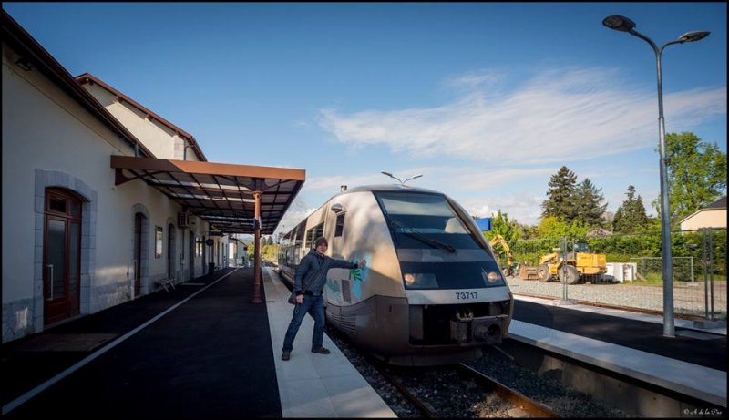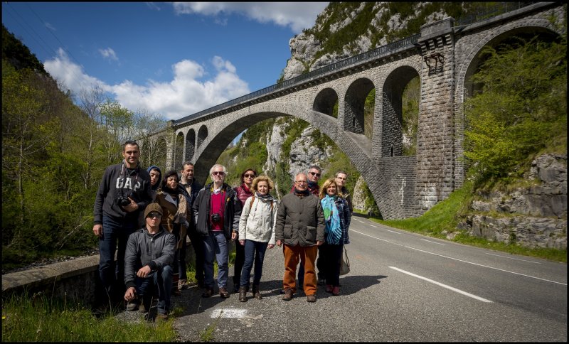 Una vez llegados a la estación de Paul en coche y con la decepción de no haber podido subir a la ciudad en el esplendoroso funicular (estaba fuera de servicio), dimos un paseo hasta el centro histórico donde los manifestantes del  primero de mayo recogían sus bártulos y nos sirvieron de guías. Comimos en la zona centro y regresamos a la estación para, esta vez sí, volver en tren y sin contratiempos que reseñar. Una vez reagrupados en Oloron y ya solo a bordo de los dos coches, iniciamos el regreso haciendo paradas continuas para examinar diversos puntos de interés de la línea que Alejandro había señalado, con atención especial al tramo entre Oloron y Bedous, totalmente renovado para su reapertura el 26 de junio de este año.  Pudimos comprobar con alegría que sí es posible que en un futuro no muy lejano se vuelva a poder viajar en tren entre España y Francia por Canfranc.