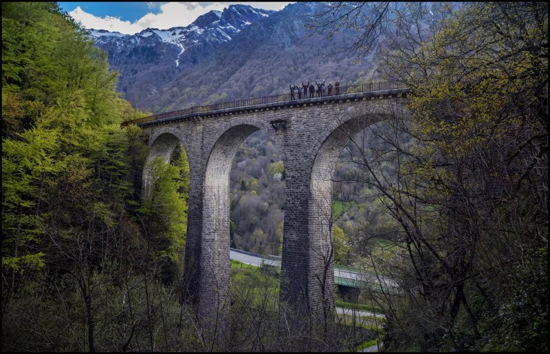 Continuamos disfrutando de magníficos paisajes naturales y ferroviarios por el espectacular valle de Aspe, examinando túneles y viaductos como los espectaculares de Escot, que volverá a soportar el paso de los trenes, o ya en el tramo aún cerrado, el de L´Arnousse, muy próximo al túnel helicoidal de Sayerce, así como otros viaductos próximos a las estaciones de Etsaut y Urdos. No fue posible localizar, muy oculto entre la abundante vegetación, el tristemente famoso puente de L’Estanguet, lugar donde descarriló el tren francés que provocó el cierre del enlace internacional en marzo de 1970. Finalmente, pasando por la estación de Les Forges d’Abel, llegamos a la boca francesa del túnel de Somport y a las instalaciones que se montaron para el mantenimiento del túnel. Hoy todo está abandonado salvo por las labores de una central hidroeléctrica muy próxima.