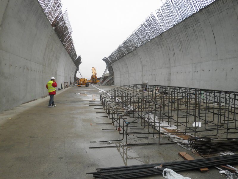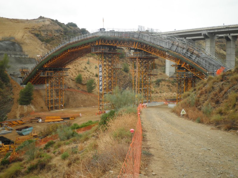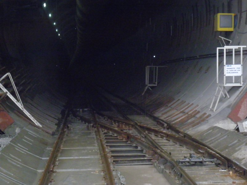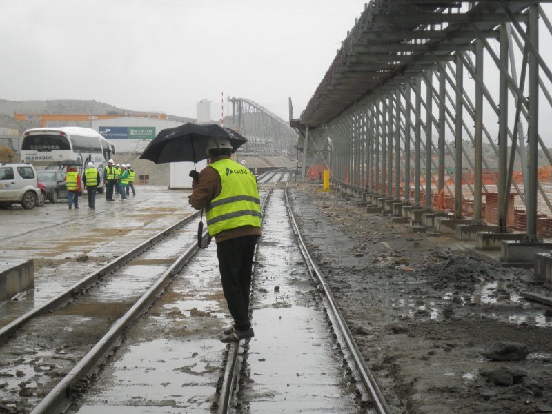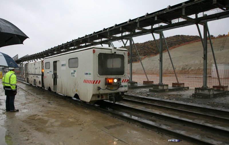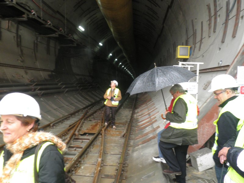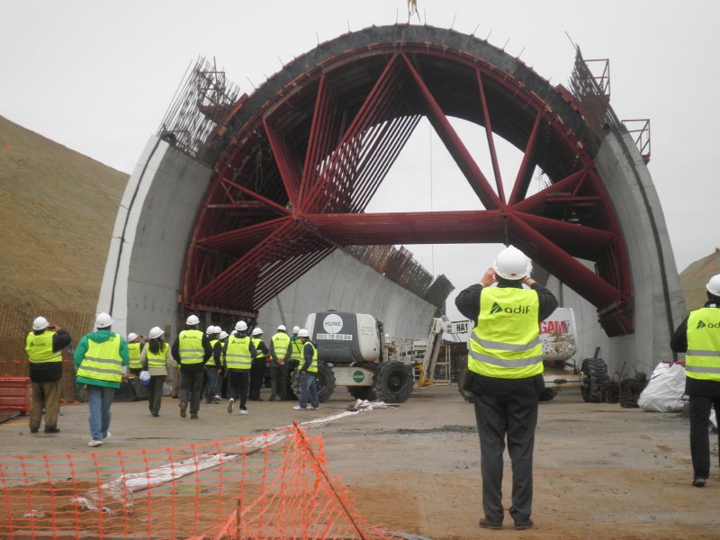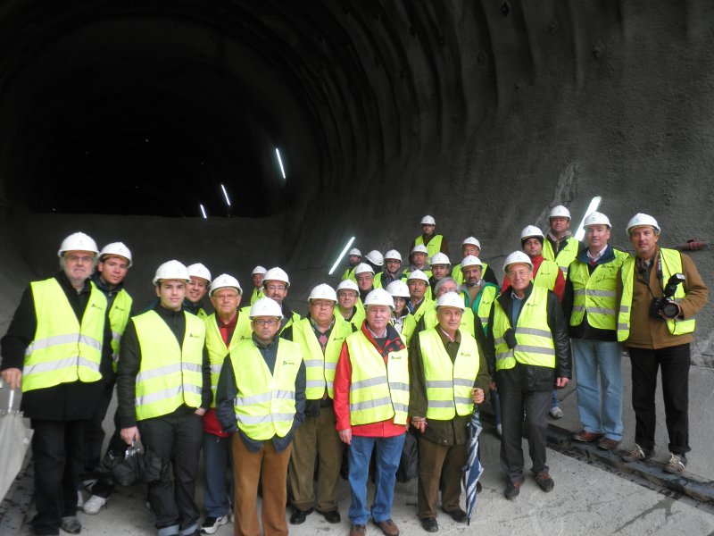 Posteriormente, a pesar de la persistente lluvia, se realizó una visita a los distintos tramos y a sus elementos constructivos más significativos, como el viaducto en arco del río Jauto (Los Gallardos – Sorbas); el túnel artificial del tramo Vera – Los Gallardos; y un recorrido final por las instalaciones de la boca norte de los túneles de 7’5 km. de longitud en el tramo Sorbas – barranco de Gafarillos, de los cuales, ya se han perforado 3’5 km. del tubo número dos. Como dato curioso, por la coincidencia de la toponimia, la tuneladora que realiza los trabajos en este punto viene de horadar el túnel de La Cabrera de la línea Madrid – Valencia, donde obtuvo un record de metros excavados por día y, ahora, se encuentra en Sierra Cabrera avanzando a un ritmo muy superior al esperado. Finalmente, en la embocadura del tubo número uno, que se encuentra preparado para recibir a la gran tuneladora una vez que finalice la excavación de su gemelo, el grupo de amigos del ferrocarril posó para la posteridad.