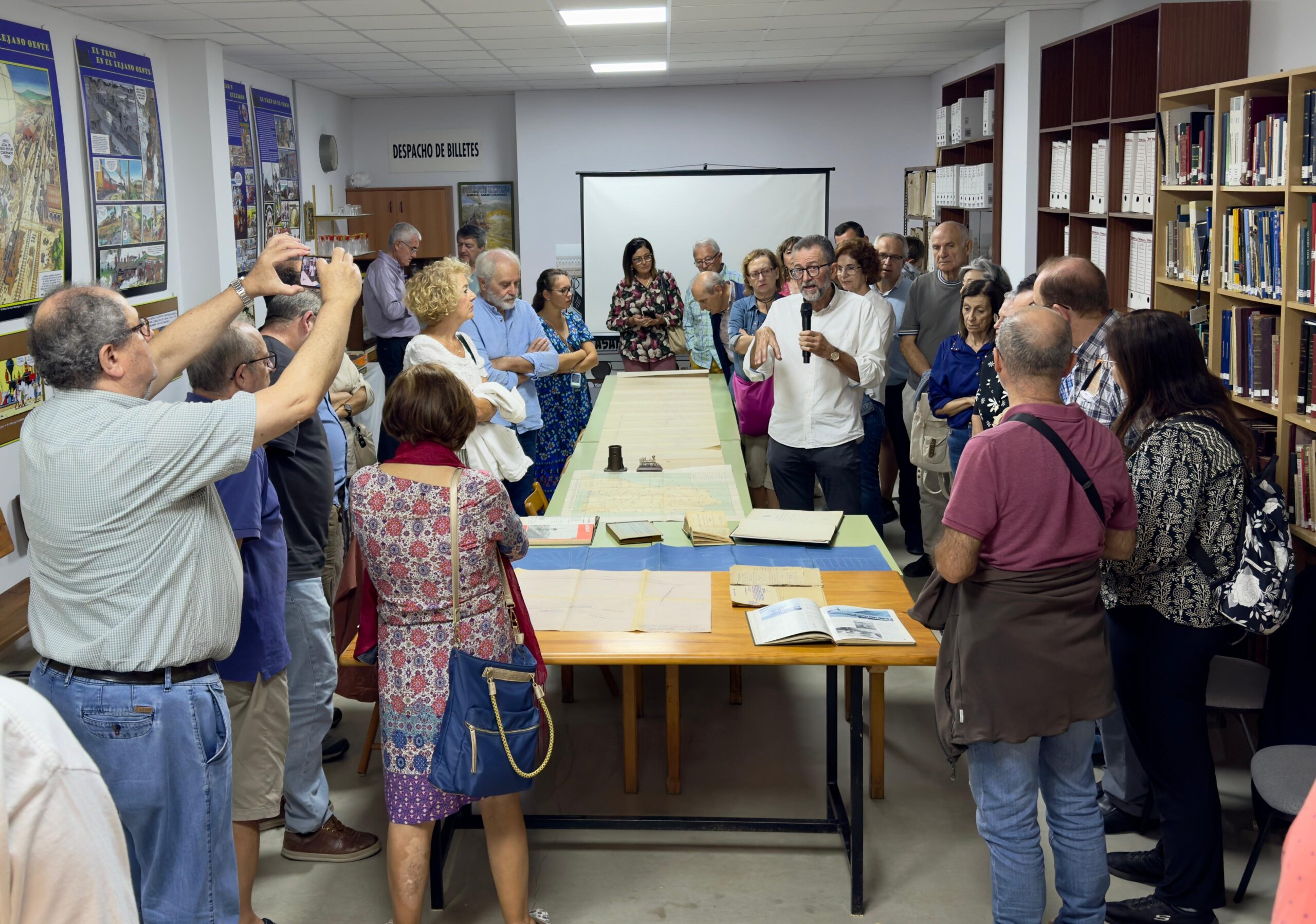 Seguidamente, Antonio Aguilera, actual secretario, tomó el testigo para iniciar el recorrido por la biblioteca y archivo con sus explicaciones sobre la muestra de documentos expuestos: varios planos de distintas épocas, documentos de índole variada, un interesante reglamento de la Compañía Sur de España o los volúmenes originales del Elementos para el estudio del problema ferroviario en España de 1918.